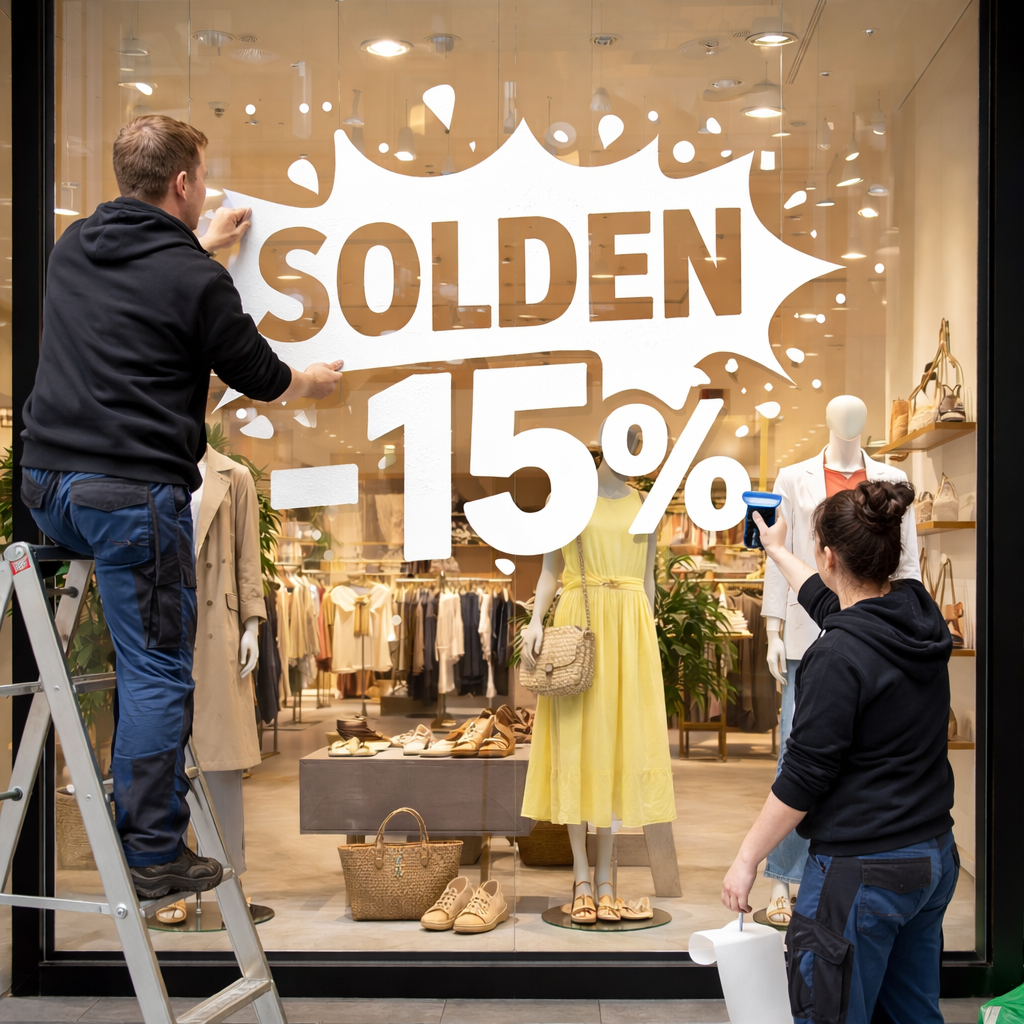 SOLDEN-sticker voor uw vitrine? Wij maken en plaatsen raamstickers op maat voor winkels en salons.
